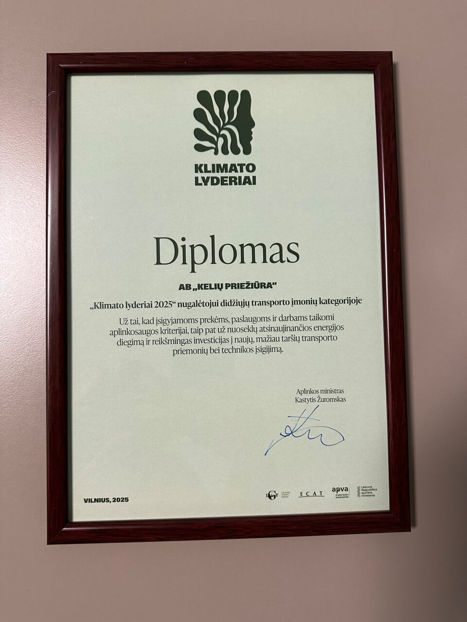 AB „Kelių priežiūra“ pripažinta didžiųjų transporto įmonių kategorijos „Klimato lydere“
