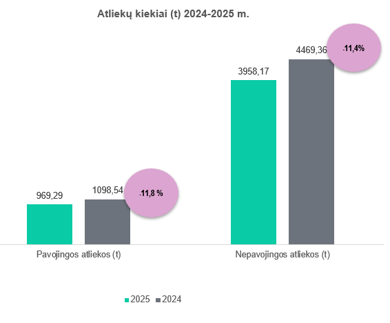 2025 m. nepavojingos atliekos sudarė 80,33 %, o pavojingos atliekos: 19,67 % visų atliekų. Lyginant su 2024 m. atliekų kiekiai sumažėjo ~11 %.