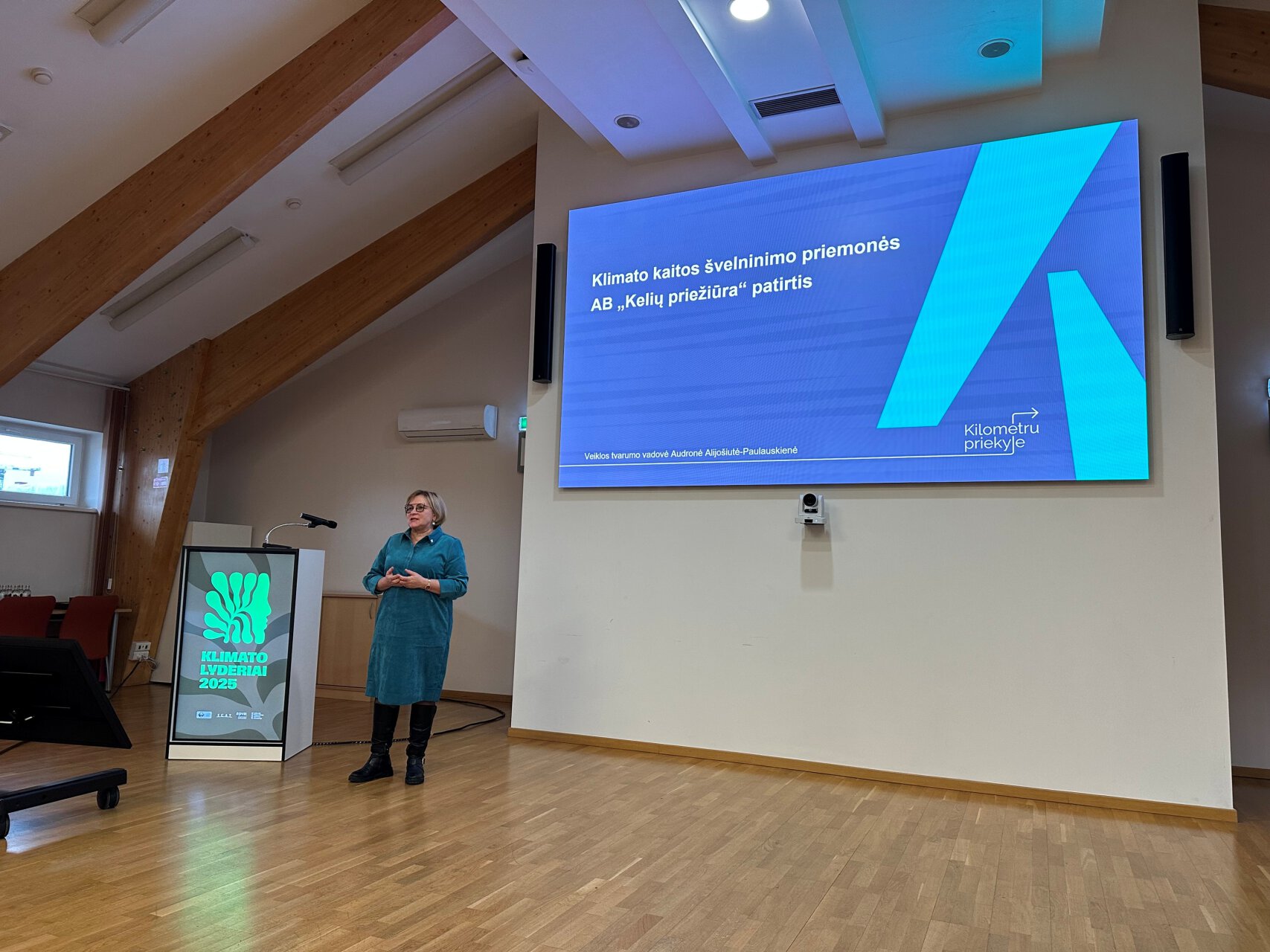 Renginio metu bendrovės Veiklos tvarumo vadovė Audronė Alijošiutė-Paulauskienė pristatė pranešimą „Klimato kaitos švelninimo priemonės: AB „Kelių priežiūra“ patirtis“. Pranešime aptarta, kaip kelių priežiūros veikloje galima efektyviai derinti veiklos specifiką, technologinę pažangą ir integruotus aplinkosauginius sprendimus, kurie leidžia sistemingai mažinti emisijas ir skatinti tvarumą.